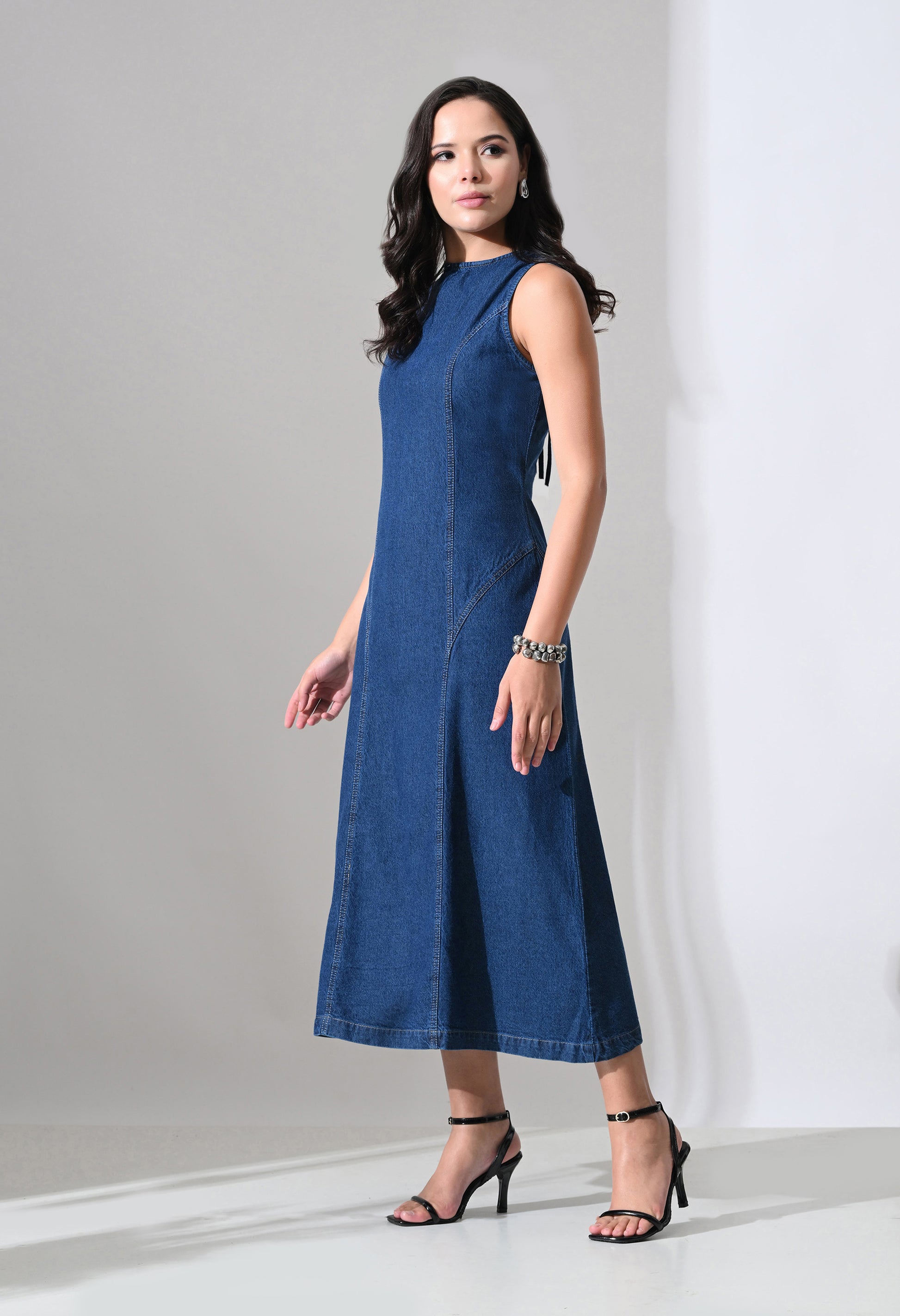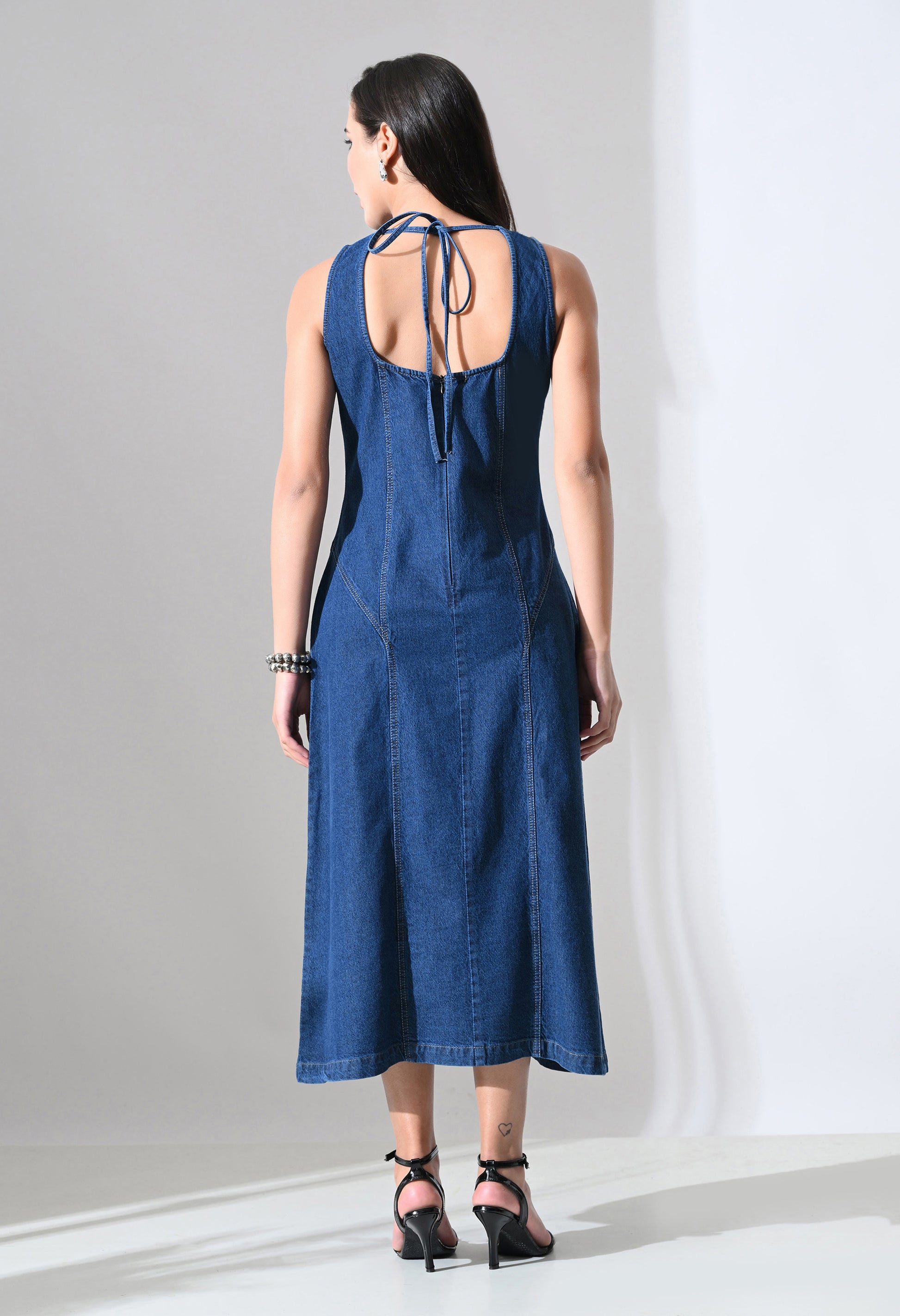 Add a touch of elegance to your everyday denim collection with this stylish sleeveless midi dress. Designed in a flattering A-line silhouette, it gently shapes at the waist and flows beautifully towards the hem for a feminine and graceful look. The clean round neckline keeps the front minimal, while the open back with tie-up detail adds a subtle yet eye-catching statement.